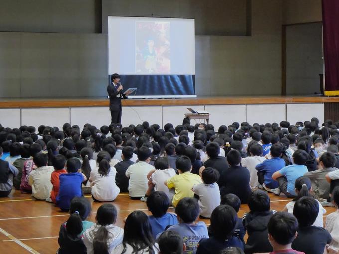 今日の「先生のお話コーナー」では、図書(書籍)をテーマにした話で、先生自身の図書との出会いや図書との関わり、図書に対する思いを熱く語ってくれました。その熱い思いは、峰っ子たちの心にしっかりと届いたようです。