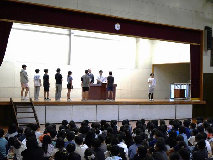 前期終業式のあとは、表彰式。「夢・アート展」「市民陸上競技大会」の表彰をしました。今回もたくさんの峰っ子が表彰されました。