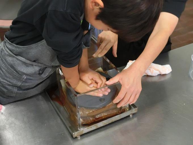 体験活動は醤油づくり。圧搾して醤油が出てくると、子供たちは「おぉーっ!」と喜びの声。