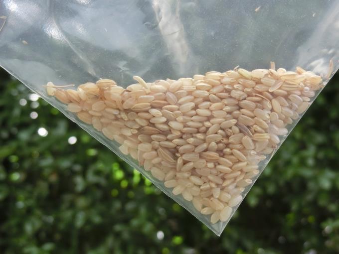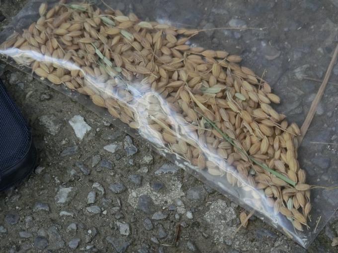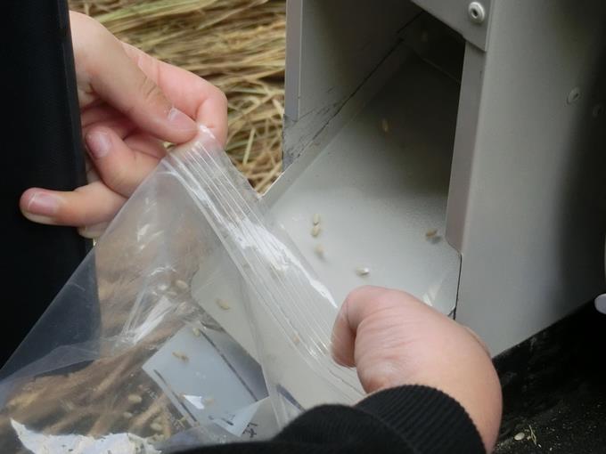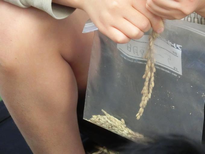 まずは、手作業で脱穀。脱穀は稲から籾を外す作業です。 農家では脱穀はコンバインを使います。コンバインは、稲刈りと脱穀を同時に行うことができるとても便利な機械ですが、今日、使ったものは、身近にあるファスナー 付き プラスチック・バッグのジップロック。
