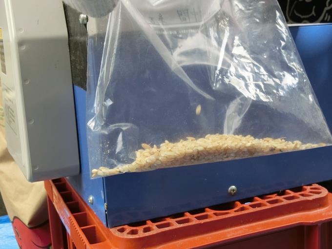 もみすり機の上部から籾を入れると、籾が2つのゴムロールの間を通過し、そのときに、籾に働く圧力とロールの回転速度の違いによって、籾殻が剥けるようになっています。