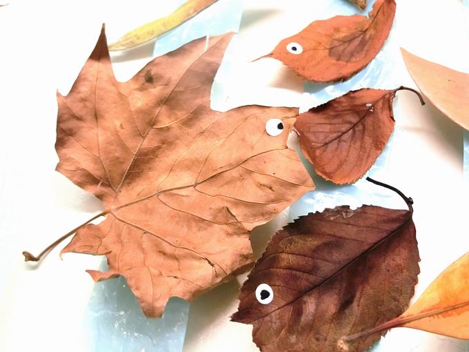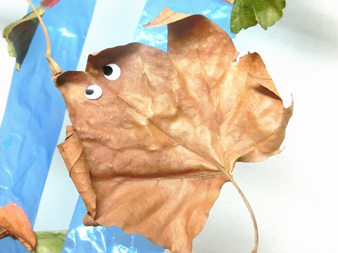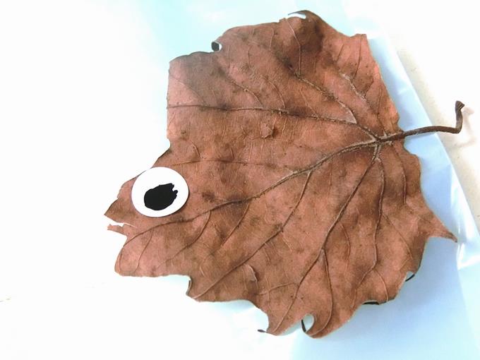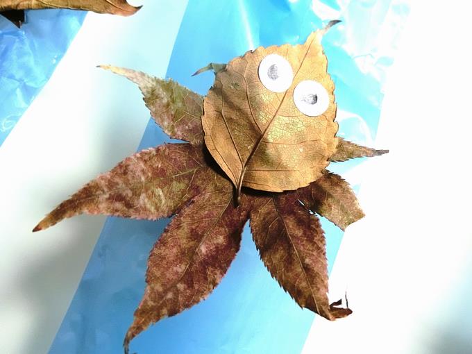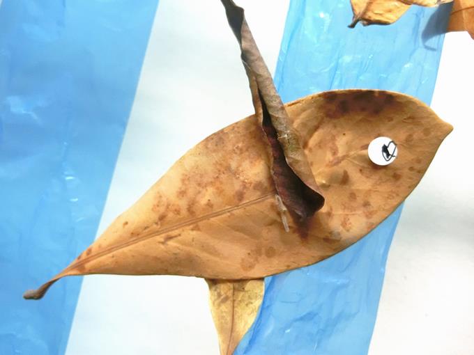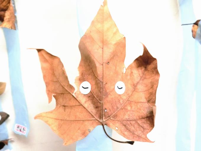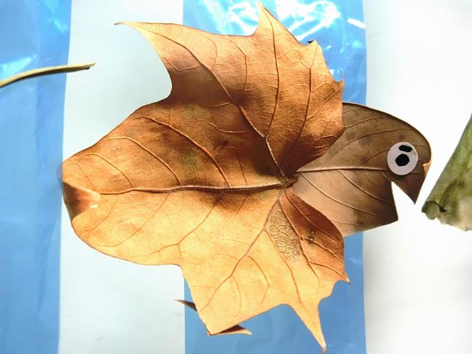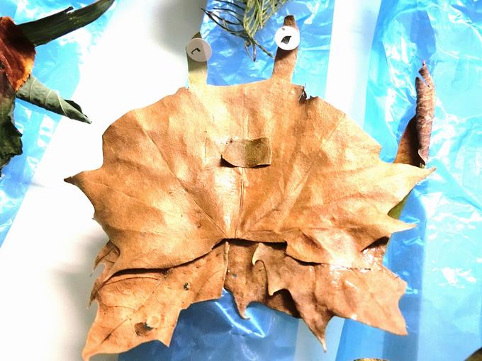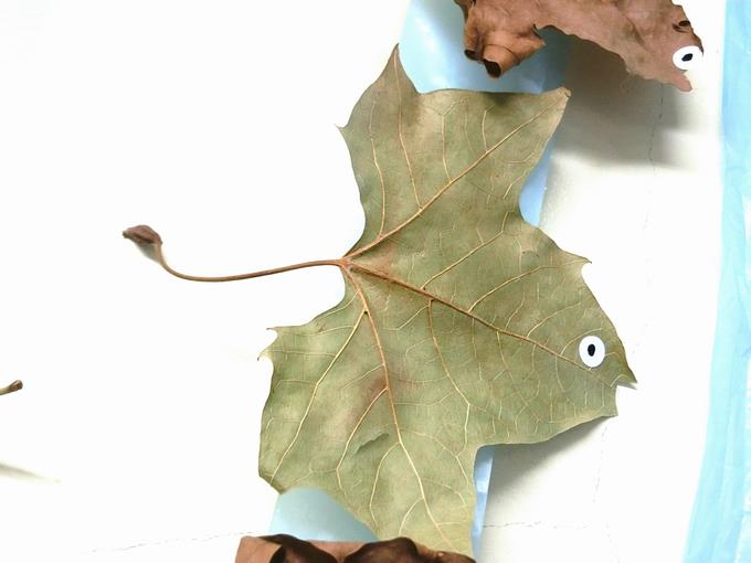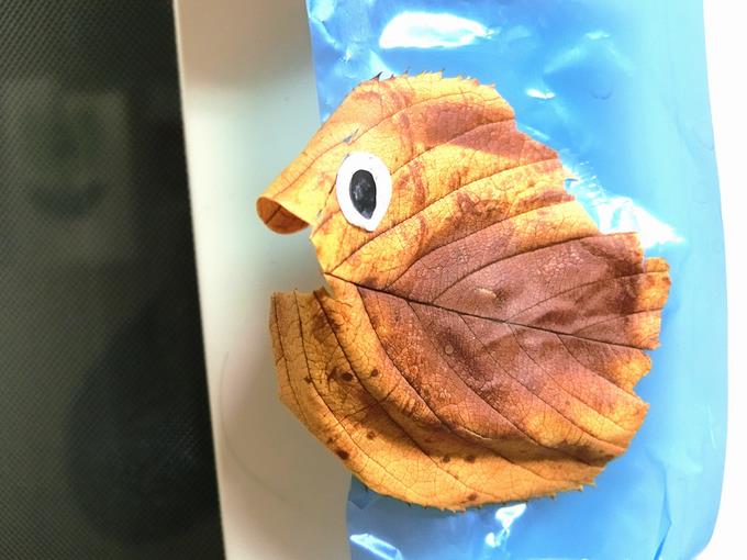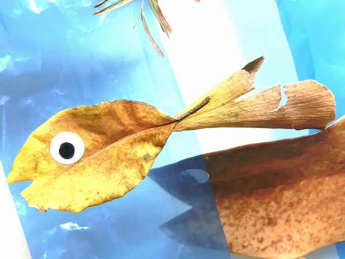 葉っぱ1枚で表現しているもの、葉っぱと葉っぱを組み合わせているものがあります。葉っぱを見ながらどんな海の生き物にしようかとじっくり考えたのでしょう。