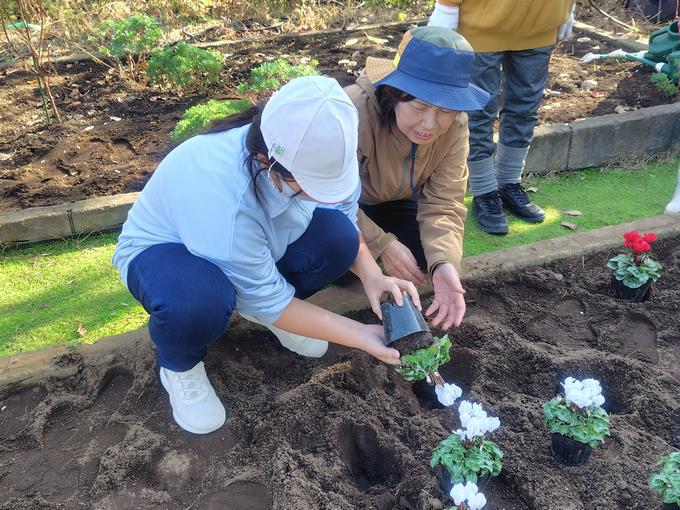 植物栽培観察園の1区画を使って、ガーデニングの会の方が考えたレイアウトで、赤色と白色のシクラメンを次々と植えていきます。