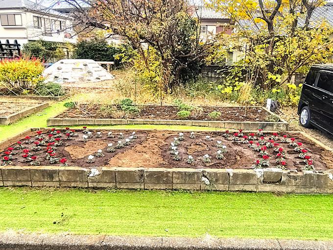 11月27日、風もなく陽光が穏やかに差し込む峰台。「ガーデニングの会」の皆様からの企画で、栽培委員会と共同で「みねっこガーデン」の創立70周年記念バージョンが完成しました。