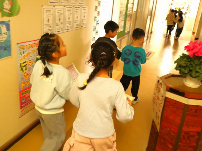 今日11月25日は、いよいよ創立70周年記念イベント「ハッピー峰っ子フェス2025」の日。給食後、仮装をしたりペイントシールを顔に貼ったりと峰っ子たちも先生たちも準備をして待ちます。開始時刻1分前、教頭先生のアナウンスが校内に流れ、それに応える峰っ子たちの元気な声が校舎中から聞こえてきました。「峰うさウォーク」のスタートです。
