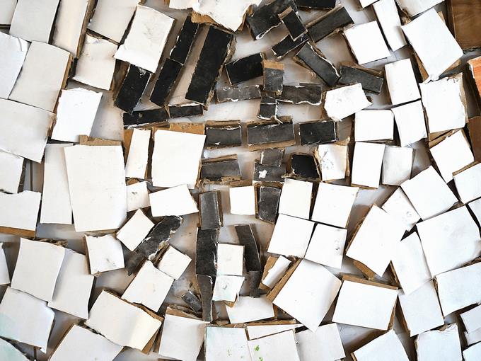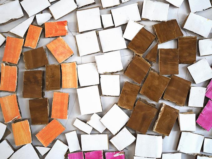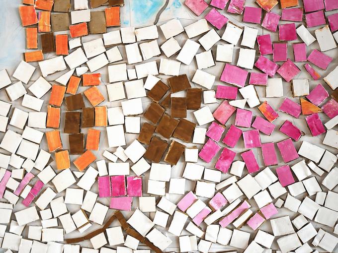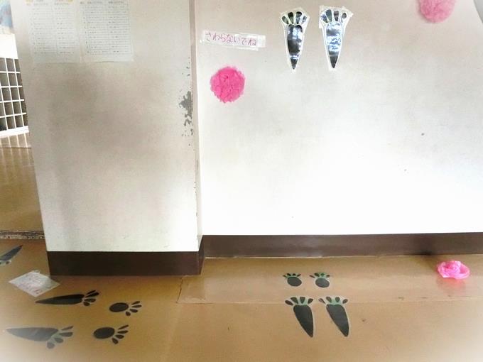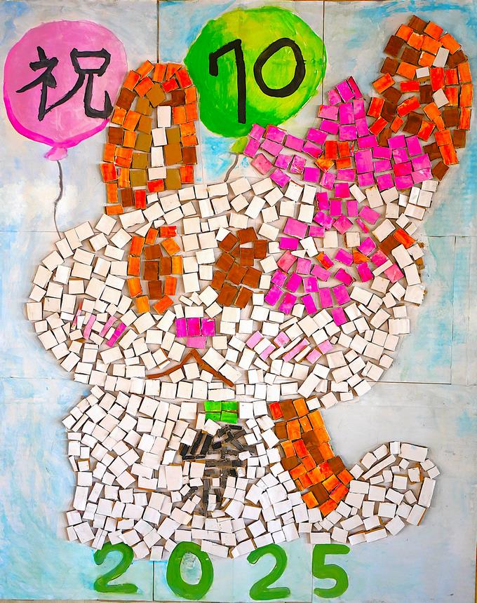 昇降口に6年生の峰っ子たちが制作してくれた創立70周年記念の「峰うさモザイク・アート」が展示してあります。