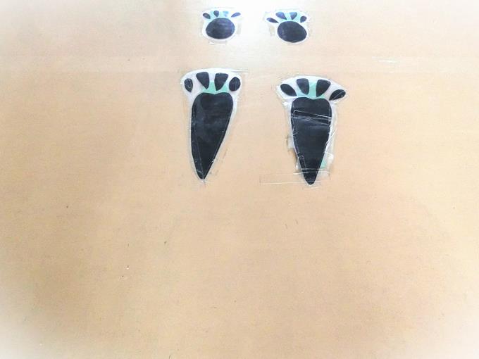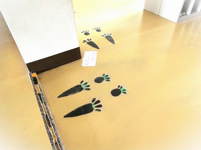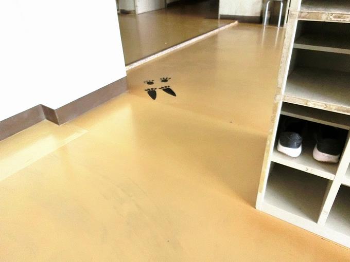 誰の足跡でしょうか。答えは昇降口の壁を見ればわかります。この足跡は、先日行われた創立70周年記念式典の際に、船橋市長様、教育長様をはじめご来賓の皆様にもご覧いただき、足跡の正体がわかると「なるほどね!」と楽しんでいただきました。