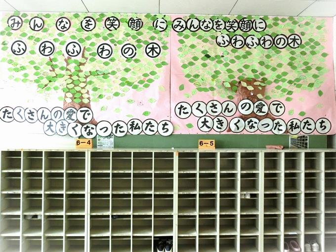 昇降口に「みんなを笑顔に、ふわふわの木」が掲示されています。