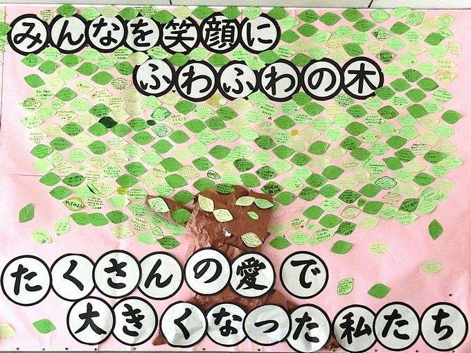 保護者の皆様にご協力いただき完成したこの「みんなを笑顔に、ふわふわの木」には、お子さんへのメッセージが一枚一枚の葉に記されています。ここにある葉をすべて読んでみると、たくさんの愛に包まれていることがわかり、心がとてもあたたかくなります。