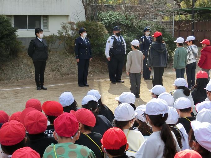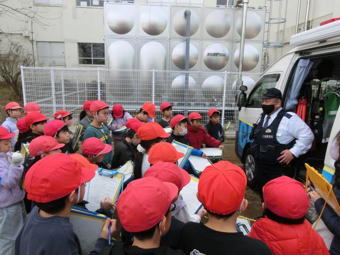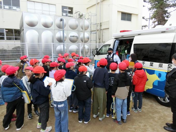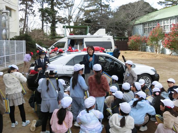 ちょうど業間休みに学校にパトカーと移動交番が到着して、「何があった?」と3年生以外の峰っ子たちも興味津々でした。3年生の峰っ子たちにとっては、社会科の学習の一環としての特別授業。