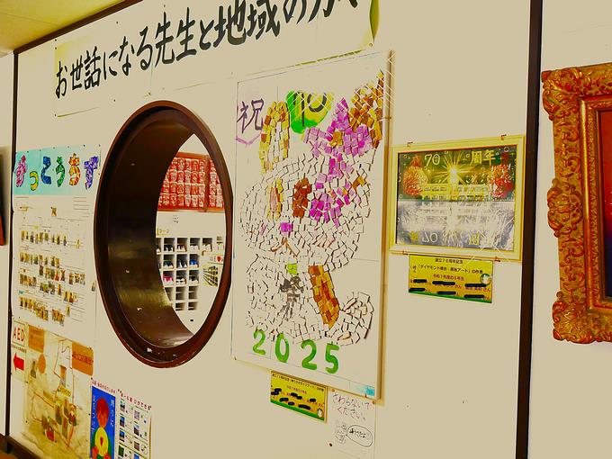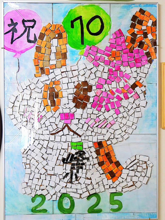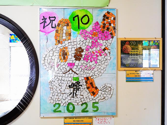 6年生が創立70周年記念として取り組んだ「ダイヤモンド峰台・黒板アート」と「峰うさ・モザイクアート」をパネル化して記念作品として昇降口に掲示しました。
