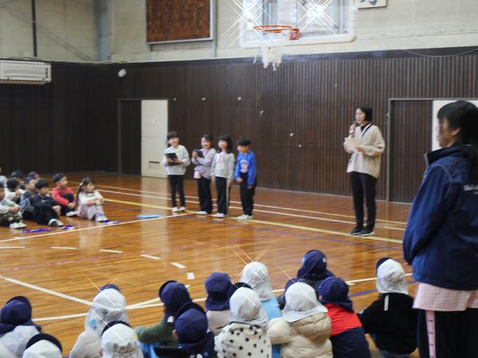 今日の集会は、校長先生の話、峰台クイズ、フレッシュ先生コーナー。校長先生の話では、冬休み期間の振り返り、3月のゴールをめざしてめあてをしっかりもつこと、今月実施する「峰台SUPER・STAGE」のお知らせの3つでした。峰台クイズは、昔のことと少し未来のことの2問。1問目は、昭和時代50年代にあった行事「新年もちつき大会」について、2問目は、令和8年度に全校児童数が減少すること。今日の問題は、簡単だったようです。