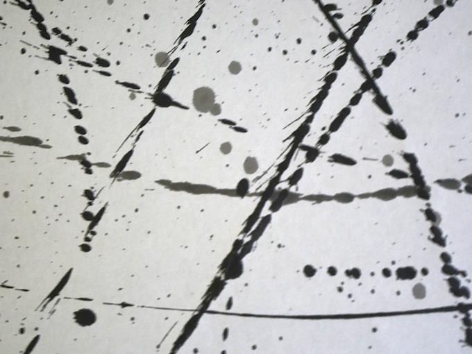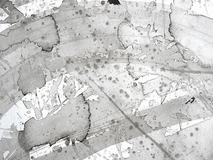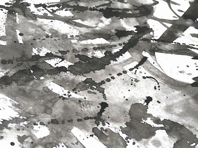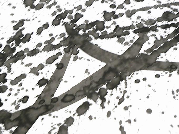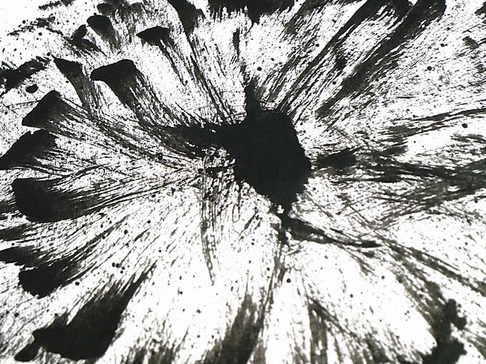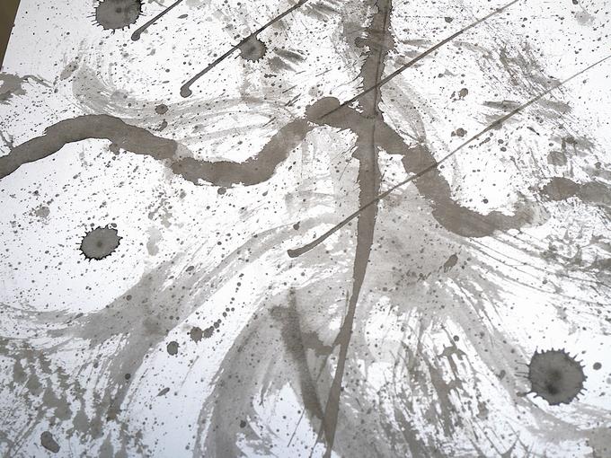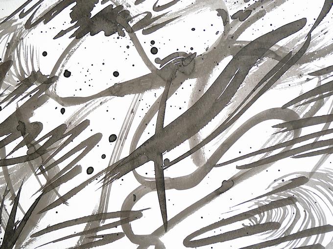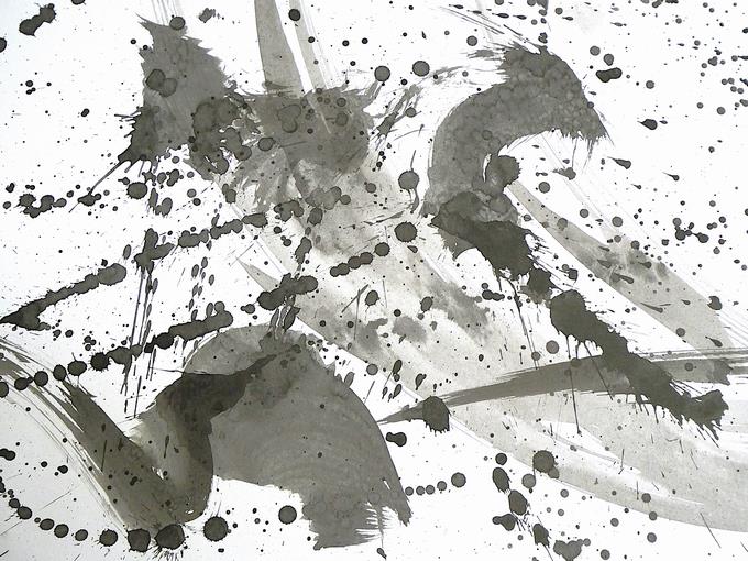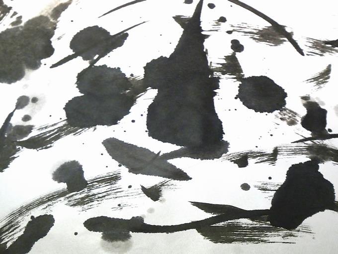 墨を水で薄めてにじませてみたり、力強く墨を画面に落としてみたり、そっと筆から墨を垂らしてみたり、一気に直線を描いたり、偶然性をねらった曲線を描いたり、そうしてできあがった唯一無二の世界がここにあります。