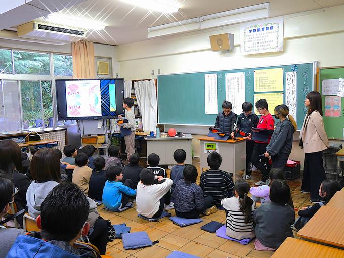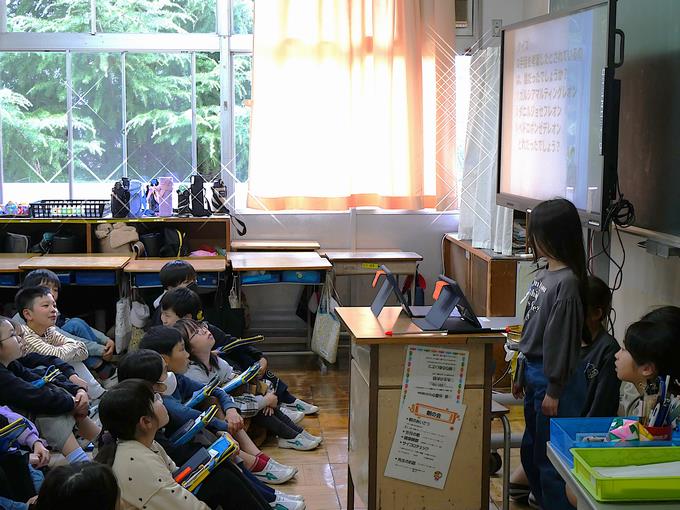5年生は、国語の学習「ひみつを調べて発表しよう」で、身の回りの不思議や興味のあるテーマについて調べ、資料を用いてわかりやすく伝える学習。ここでは情報の整理、構成の工夫、そして効果的な提示資料の作成が主な活動の柱となります。