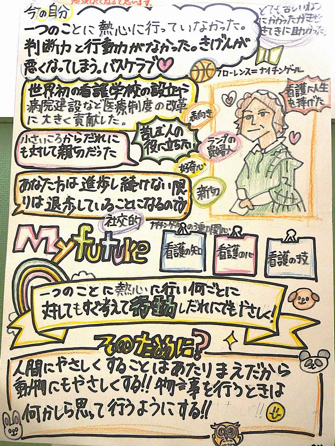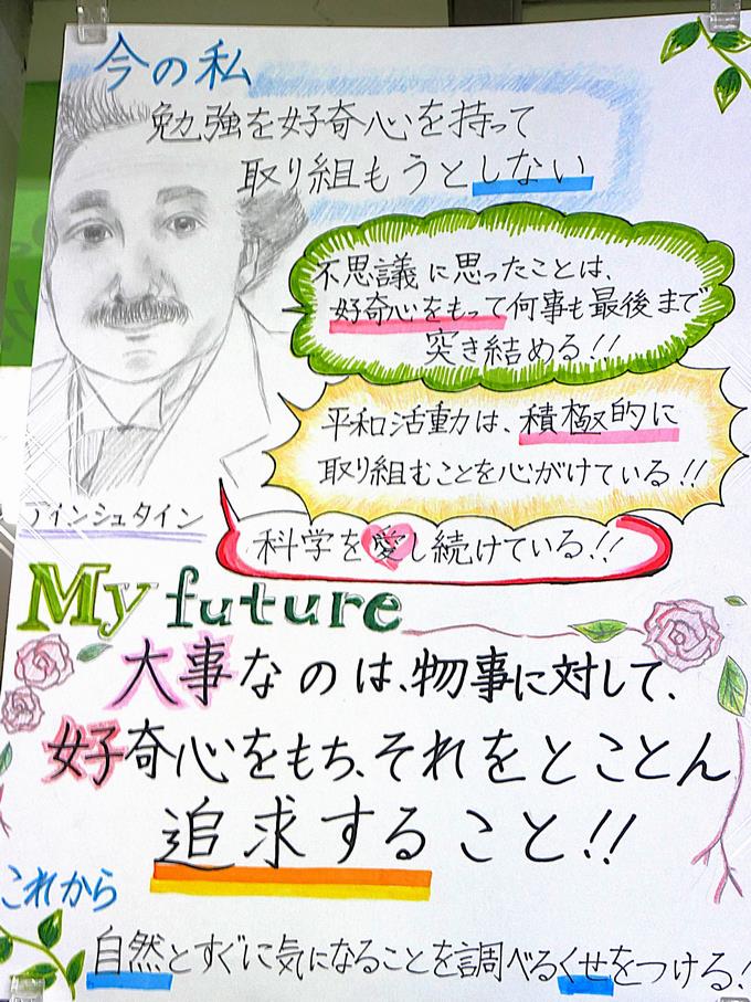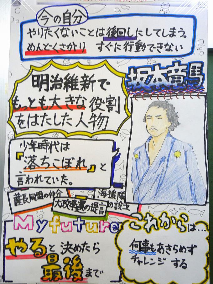 6年生の2月・3月という時期は、小学校卒業を控え、中学校という新しい環境に向かう大切な節目です。今、6年生の廊下には、偉人の生き方を鏡にして自分を見つめ直すことで、将来への具体的なイメージ「My Future」をまとめた作品が掲示されています。その一部を紹介します。