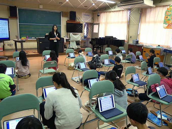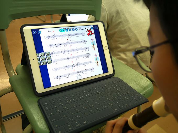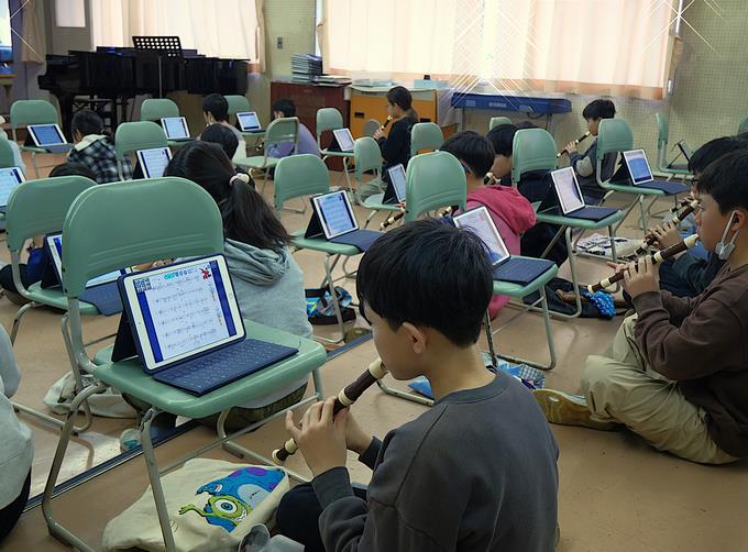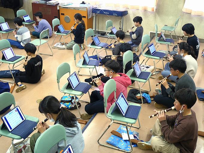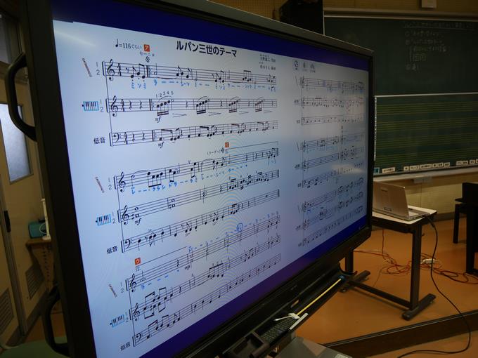 5年生の音楽の時間を参観しました。みんなで「ルパン三世のテーマ」をリコーダーで演奏していました。