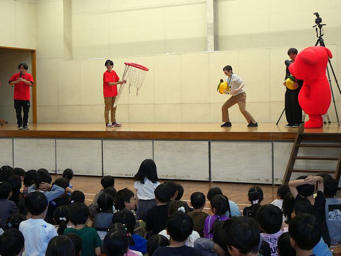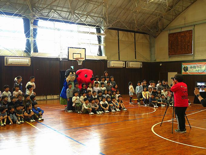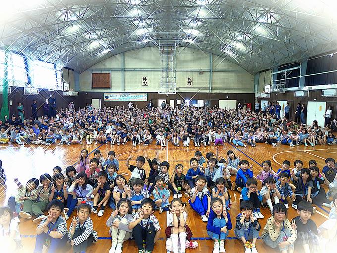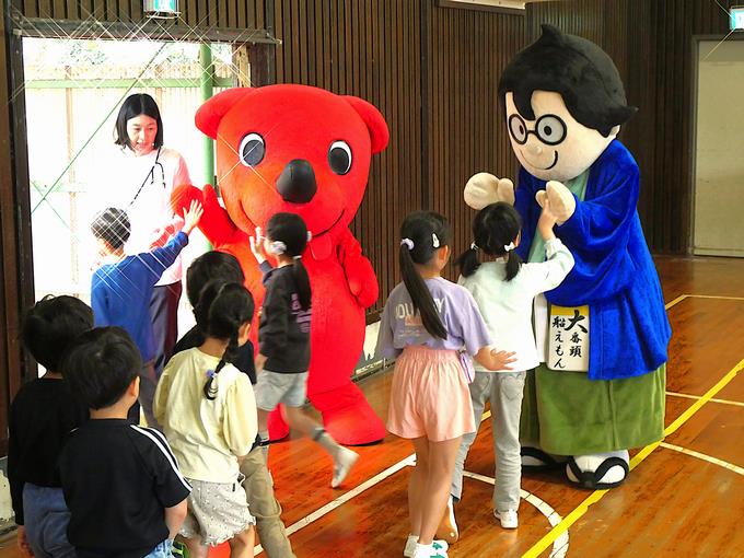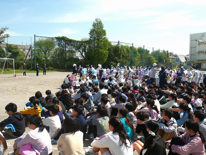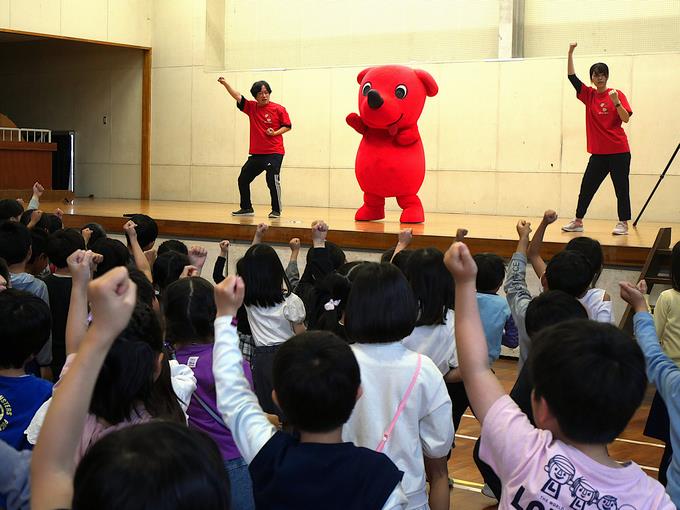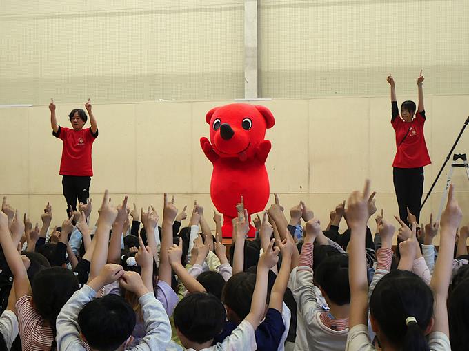 今日は、チーバくんと船えもんが峰台小学校にやってきました。入学、進級記念イベントとして集合写真の撮影をしました。みんなでチーバくんと船えもんを呼ぶとご機嫌な様子で登場。低学年、中学年、高学年で峰っ子たちの反応に違いがあるのも面白かったです。