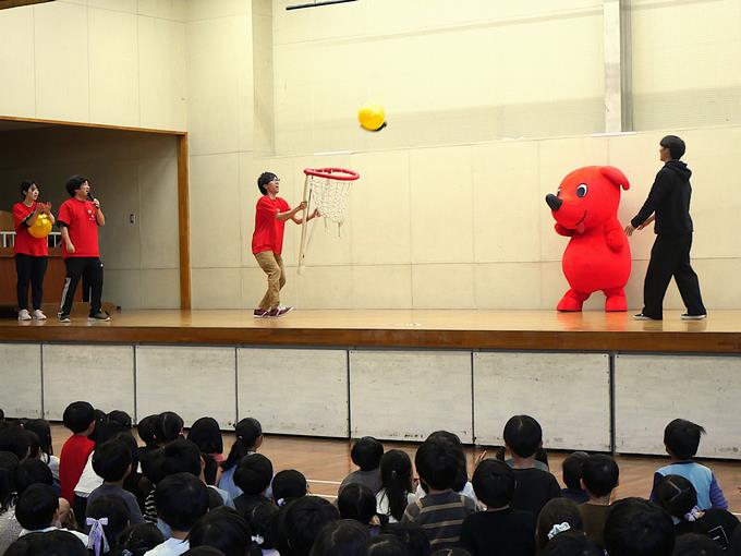 代表の先生が、チーバくんからの峰っ子たちへのプレゼントをゲットするために、バスケットゲームにチャレンジ。2人の代表の先生は見事成功しました。プレゼントは「チーバくんクリアファイル」、先生たちには「チーバくんマスキングテープ」をいただきました。