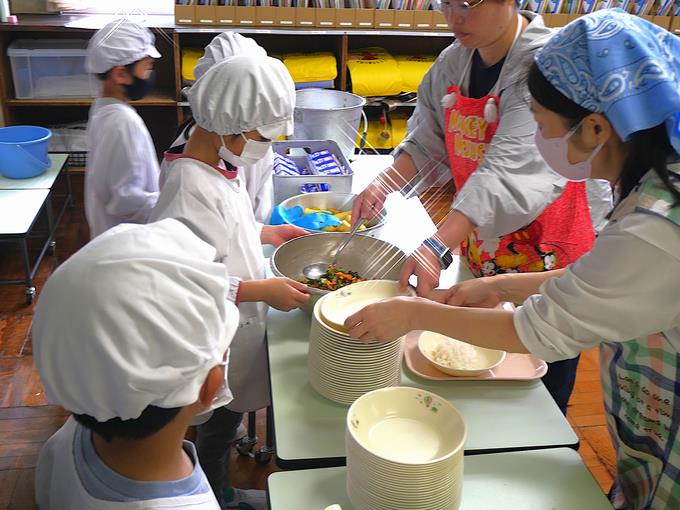 今日から1年生も給食がスタート。給食当番のお仕事も始まりました。担任の先生とサポートの先生から配膳の手順を丁寧に教えてもらい、いよいよ配膳を始めます。