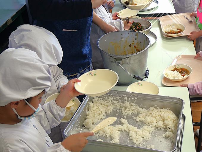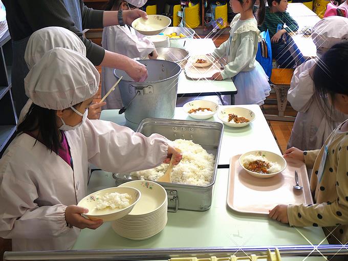 給食当番さんは、協力しながら丁寧に配膳をしていきます。しっかりと説明を聞いていたので、とてもスムーズに配膳が進みます。そして、とても静かです。