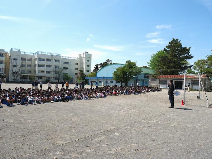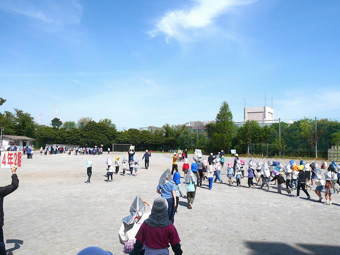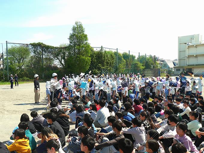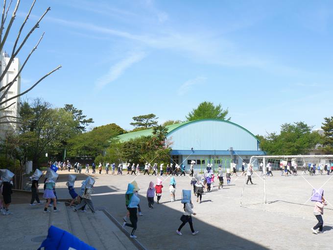今日の峰台は、朝からウグイスの鳴き声が心地よく、空気も澄んでいて、そして、爽やかな晴天。2時間目に第1回目となる避難訓練を実施しました。今回の想定は、「授業中に大地震が発生。校舎倒壊の恐れがあるため、全校児童一斉に校舎外へ緊急避難。」というものでした。校舎内での一次避難を終えて、校舎外の避難場所に向かいます。みんなとても落ち着いて移動しています。