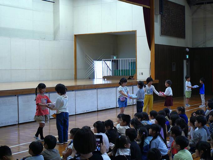 2年生からプレゼントももらいました。そして、1年生からのお礼の場面では、しっかりとお礼を言った後、1年生みんなで、今年度の峰台小学校の合言葉「WE💜峰台! WE ARE MINEDAI ✌」を元気よく、かっこよく、大きな声で言ってくれました。1年生もすっかり「峰っ子」になっています。