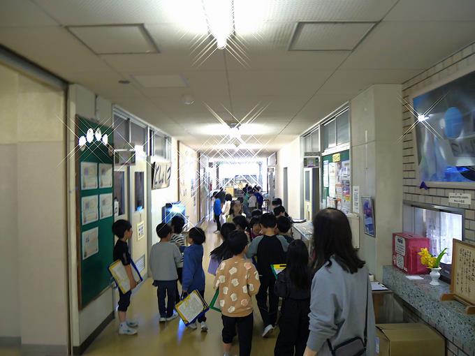 探検シートにはミッションがいくつも書かれていて、それをクリアするために学校の中を巡ります。お兄さんお姉さんになった2年生の峰っ子たちはとても張り切っていました。1年生の峰っ子たちはというと色々なものを見て興味津々。 その場で2年生の峰っ子たちが、いろいろなことを教えていました。