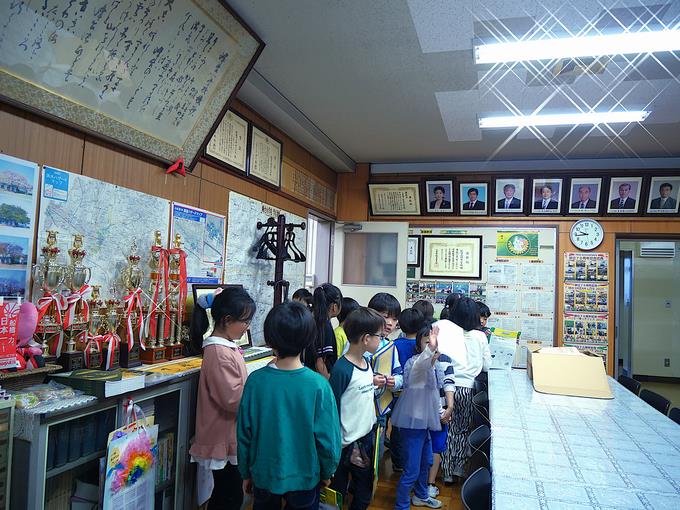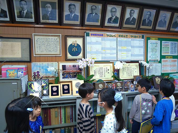 校長室にも来てくれました。歴代校長先生の写真を見ながら、「25人いる」「女の校長先生1人だけ」と発見したことを話していました。校長室にあるアメジストや水晶、ダイヤ等の石や化石に興味をもった峰っ子も。学区地図を見て自分の家を探している峰っ子も。ピカチュウやラッキーを発見して喜んでいる峰っ子も。