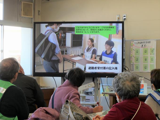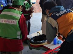 備蓄食料の作り方の実演、避難者受付の仕方の説明と携帯トイレの使い方の説明を視聴、そして、実際に受付の訓練をしました。その後、外に移動して、携帯トイレの取り付けと処理の仕方の訓練をしました。