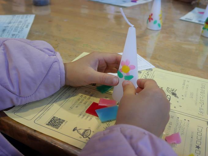 1年生の峰っ子たちは、それぞれが考えていたイメージを形にしていきます。どんどん創作活動が進む子、途中で悩みながらデザインを変更する子、カラフルに色を組み合わせる子、丁寧に飾り付けをしている子等、様々な姿が見られました。時間内に全員が素敵なキャンドルを完成させました。