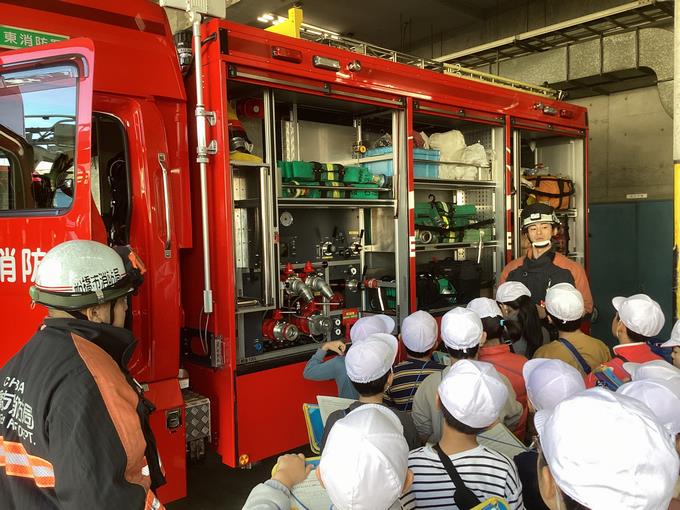 前原分署は、船橋市で唯一、危険物質に対応する化学中隊があるところで、はしご車や救急車の他に船橋市に2台しかないといわれる化学消防ポンプ車を見せてもらいました。見学の途中で、救急車が緊急出動する場面もありましたが、それもまた貴重な体験でした。室内では、事務室や仮眠室、食堂やトレーニング室などを見せてもらいました。見学中にも、何度も放送で船橋中の出動要請が流れ、消防士さん達も気が休まらないとおっしゃっていました。