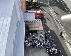 校庭にいた子供たちは、先生の指示で中央に素早く集合しています。校舎内の子供たちも先生と一緒に校庭に避難してきます。