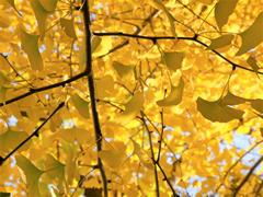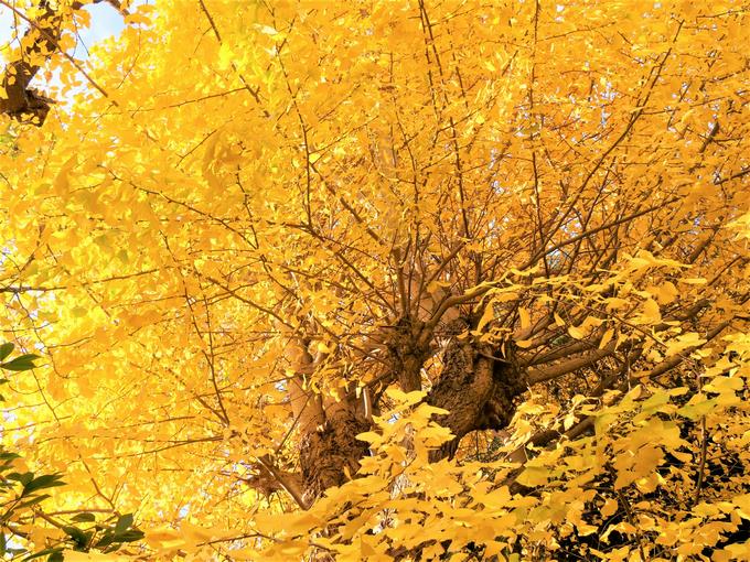 少しずつ近づいてみます。黄色がとても鮮やかな今の時期だけの姿です。イチョウのきれいな姿には、登校してきた子供たちも見上げていました。
