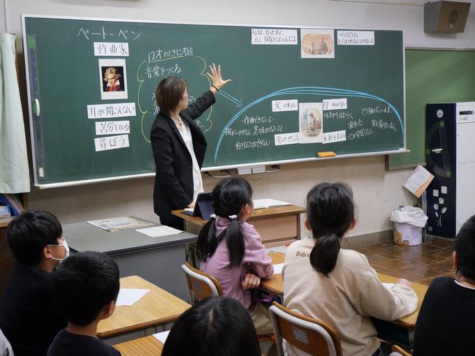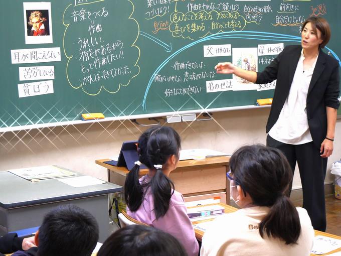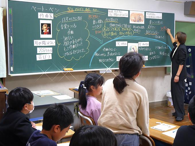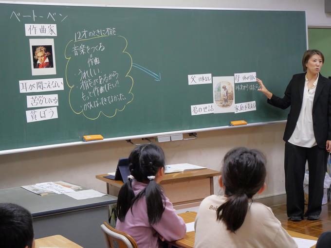 ■4時間目は、第5学年の授業。主題名は、希望をもって A-(5)『希望と勇気、努力と強い意志』です。扱う教材は、『ベートーベン』(出典:「新しい道徳5」東京書籍)。