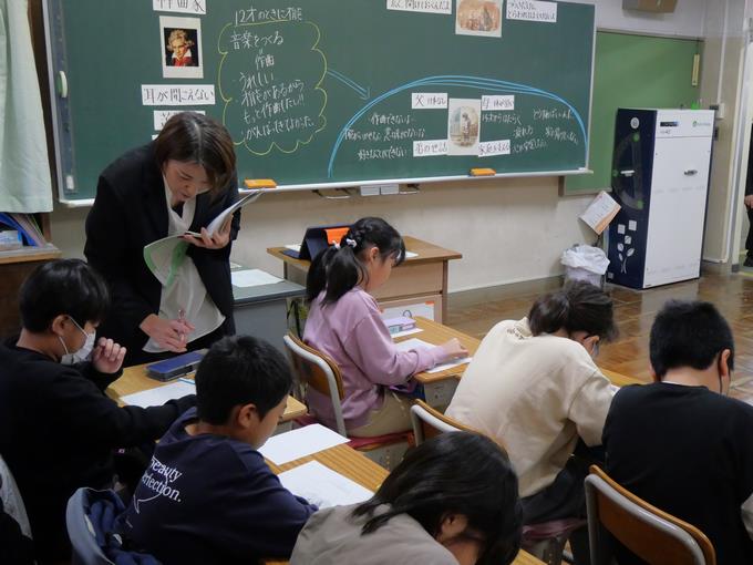 展開後段では、今までの自分を振り返り、これからの自分にどんな言葉を伝えたいか未来の自分に手紙を書く活動。困難があっても挫けずに希望をもって、夢や目標を実現しようとする心を客観的に見ます。そして、終末では、「交響曲第6番~田園~」が流れます。自然が呼び起こす人間の心の内なる感情や自然の中で安らぎを得た感動を表現した楽曲に触れ、余韻とともに授業が終わりました。