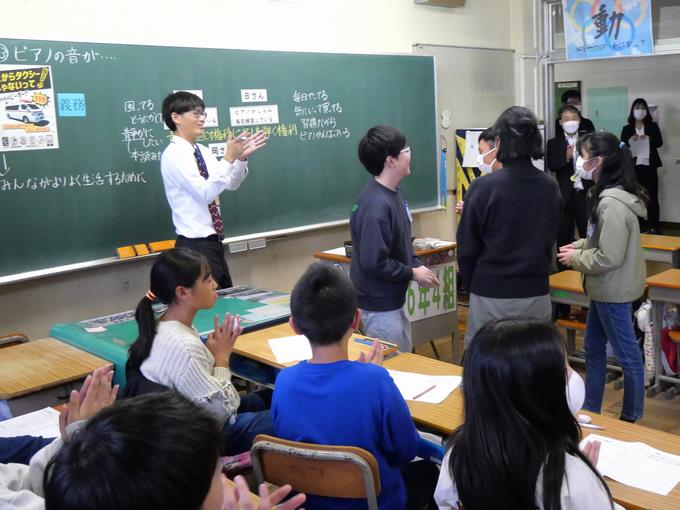 ■5時間目は、第6学年の授業。主題名は、みんなの生活を守るために大切なこと C-(12)『規則の尊重』です。扱う教材は、『ピアノの音が……』(出典:「新しい道徳6」東京書籍)。
