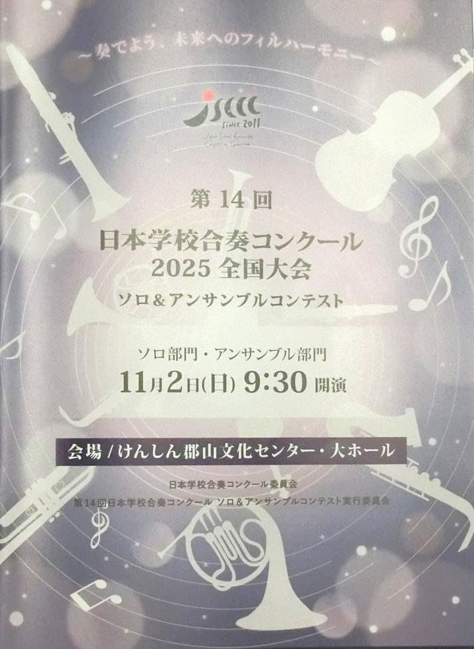 11月2日の日曜日、福島県郡山市の「けんしん郡山文化センター・大ホール」で開催された「令和7年度 日本学校合奏コンクール2025全国大会」に予選審査を通過した峰台小・音楽部が参加しました。