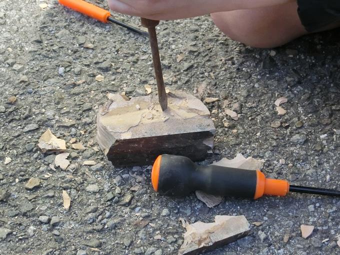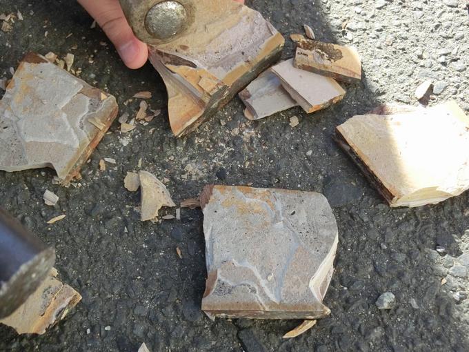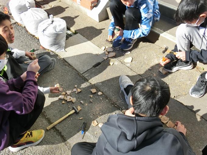 6年生がドライバーや金づち等を使って堆積岩を慎重に砕いていました。理科の学習の一環として化石発掘体験です。12月15日と16日の2日間で、6年生全員が体験をしました。