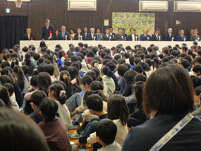 低学年のクラス写真撮影の後は、全校児童で記念撮影をしました。