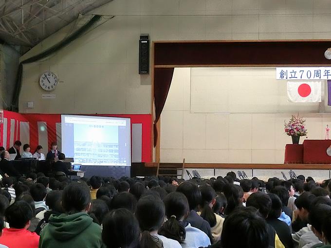 記念品を紹介した後は、「峰台の歌声」の披露の時間です。創立70周年記念式典に相応しい楽曲「はじまりの歌」を全校でしっとりと美しく歌い上げました。