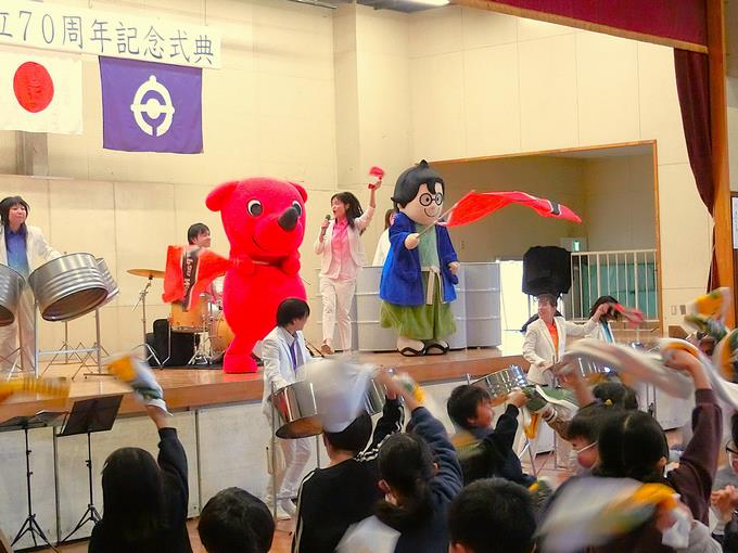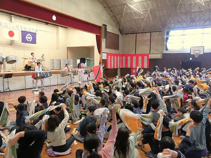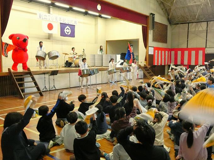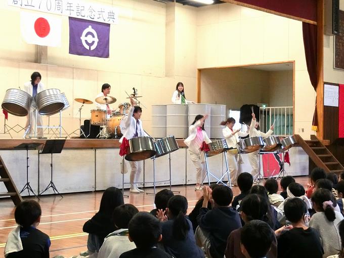 アンコールでは、みんなびっくりのサプライズ、峰台小学校の校歌をアレンジしてくれていました。演奏に合わせて校歌を気持ちよく歌いました。それにしても峰っ子たちのパワーにはビックリでした。ライブの中で、スチールパンの歴史も劇風にわかりやすくレクチャーしてもらいました。