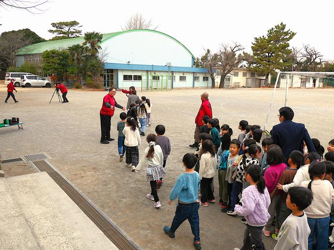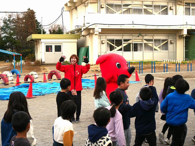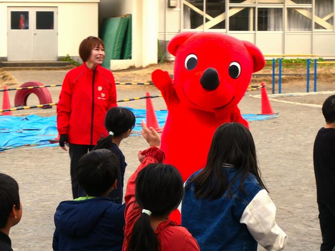 校庭に出るとチーバくんが待っていました。低学年の峰っ子たちは大喜びで写真撮影。