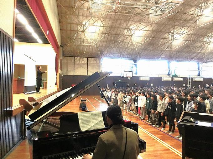 今日は冬休み前の全校集会を体育館で実施しました。まずは全校で気持ちよく校歌を歌います。