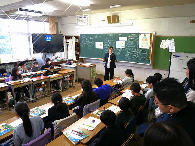 4年生は、総合的な学習の時間の取り組み「普段のくらしをしあわせに」で、今までに調べてきたことをタブレット上でまとめ、発表する場面でした。