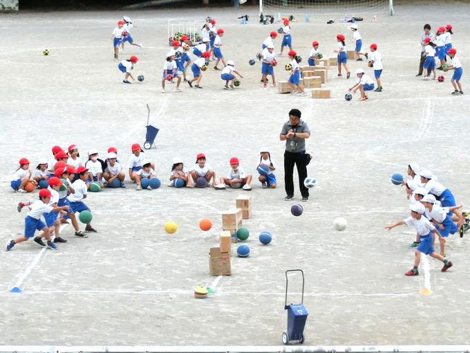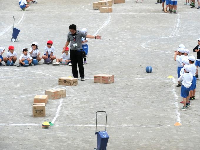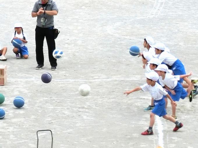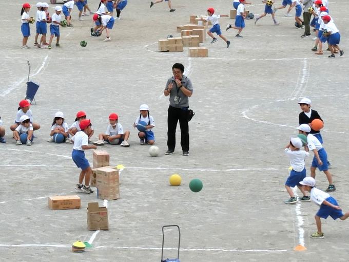 このゲームの結果は、白チームの勝ち。投げ方やどの的(段ボール)をねらうか、そこに勝つためのヒントがありそうです。楽しそうな1年生の峰っ子たちでした。