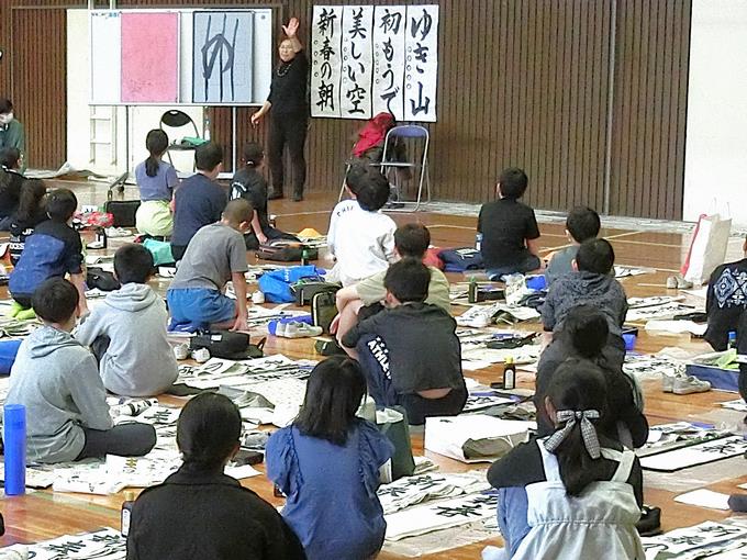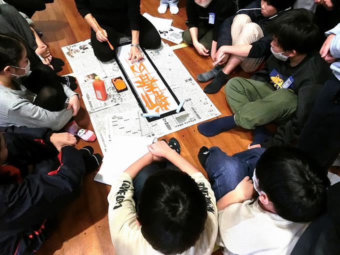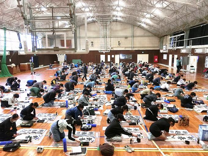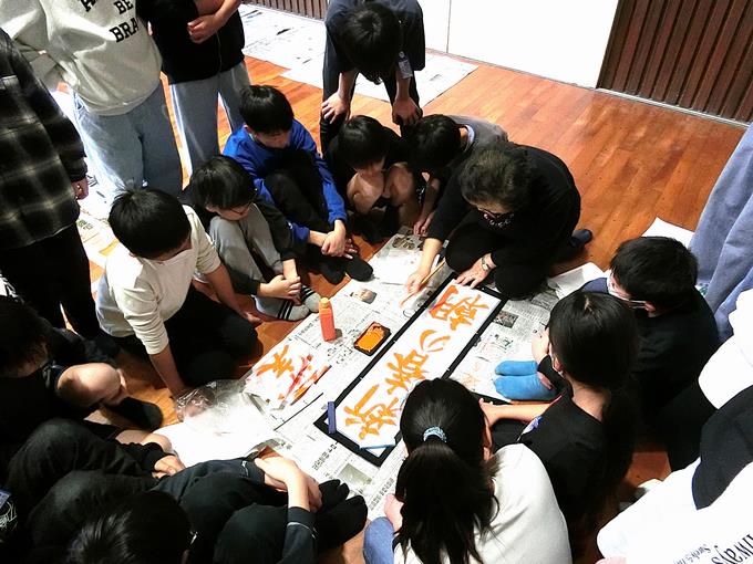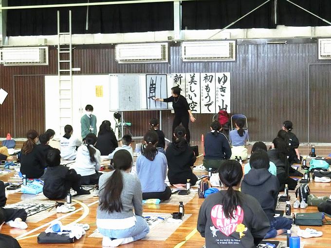 12月11日と12月12日の2日間、書き初めの特別授業を実施しました。体育館に学年ごとに集まり講師の先生からアドバイスを受け、練習しました。