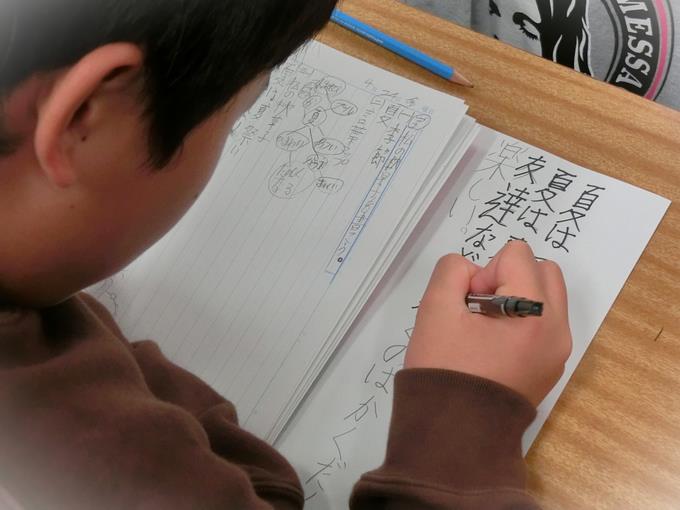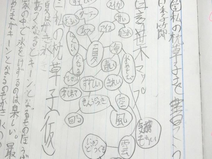 今日は、6年生の国語の授業の様子を紹介します。峰っ子たちは、「枕草子(春はあけぼの)」の学習の一環として現代版の枕草子「Myあけぼの」を書いていました。季節を選び、言葉マップでウェビングをしてから、オリジナル作品へと進みます。言葉のつながりがとても大切になります。清少納言の「鋭い観察眼」と「独自のセンス」を理解した上で、現代の自分たちの感覚で言葉を綴るのがコツです。