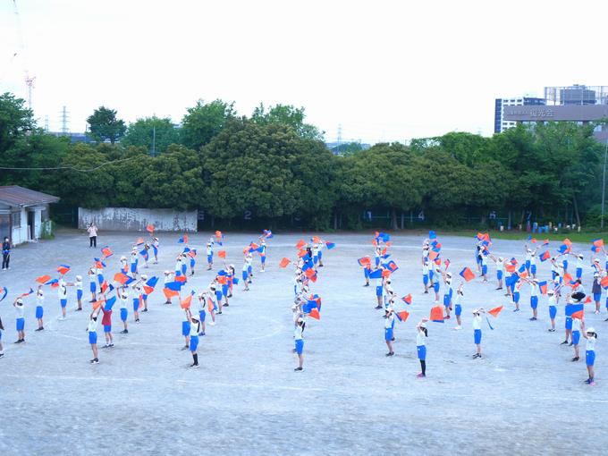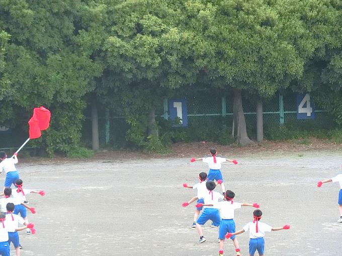 6年生は、校庭でフラッグ種目のフォーメーションとタイミングの確認をしていました。どんどん整っていく様子は、さすが最高学年という感じです。