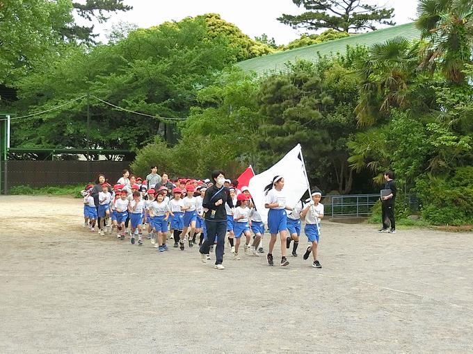 業間休みは、低学年紅白リレーの練習。ここでも応援団が活躍していました。入場から、フィールド内スタンバイ、リレー、退場まで一連の動きを確認していました。それにしてもリレーの選手、やっぱり走る姿は格好いいです。