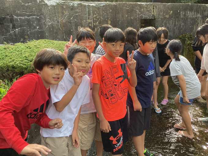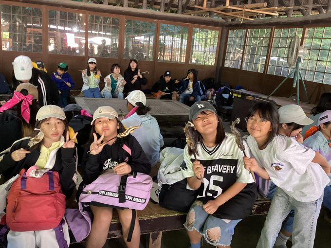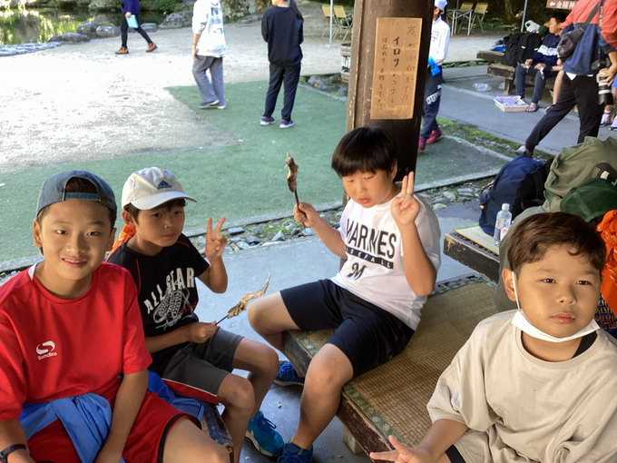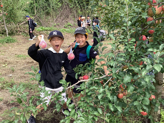 2日目は、白根魚苑で釣り堀や魚のつかみ取り、焼き杉体験に分かれ、そのあとに原田農園でりんごのもぎ取り体験をしました。